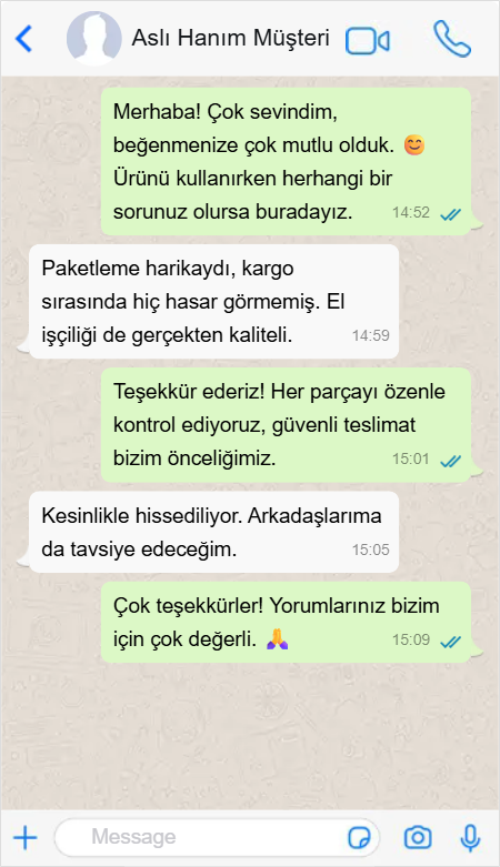 Siparişim sorunsuz ve hızlı geldi. Müşteri hizmetleri çok ilgiliydi, her soruma hemen yanıt aldım.