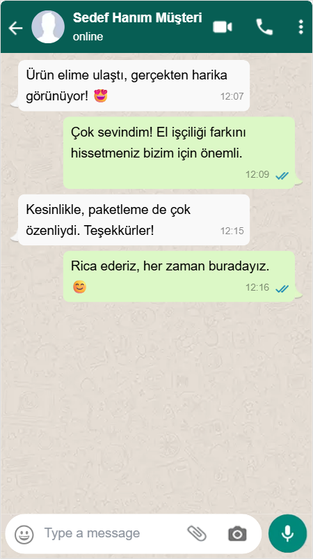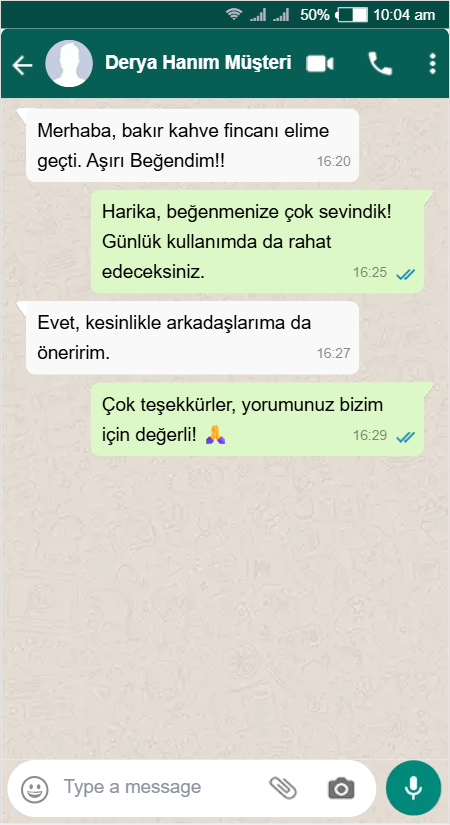 Bakır ürün gerçekten şık ve dayanıklı. Alışveriş deneyimim çok güven vericiydi, tekrar almayı düşünüyorum.